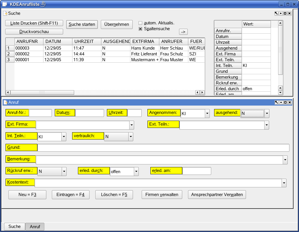 Kommunikation in einem Unternehmen zu optimieren. Es können kurze Nachrichten für Kollegen eingetragen werden, z. B. wenn ein Kunde anruft und einen bestimmten Mitarbeiter um Rückruf bittet oder ihm nur eine kurze Nachricht hinterlassen möchte. "kdeanrufliste" soll sozusagen den Schmierzettel ersetzen, der dem Kollegen sonst möglicherweise auf den Schreibtisch gelegt würde. Jeder ein- oder ausgehende Anruf erhält eine eindeutige Anruf-Nummer zugewiesen. Ebenfalls mit erfasst werden beispielsweise folgende Daten:
